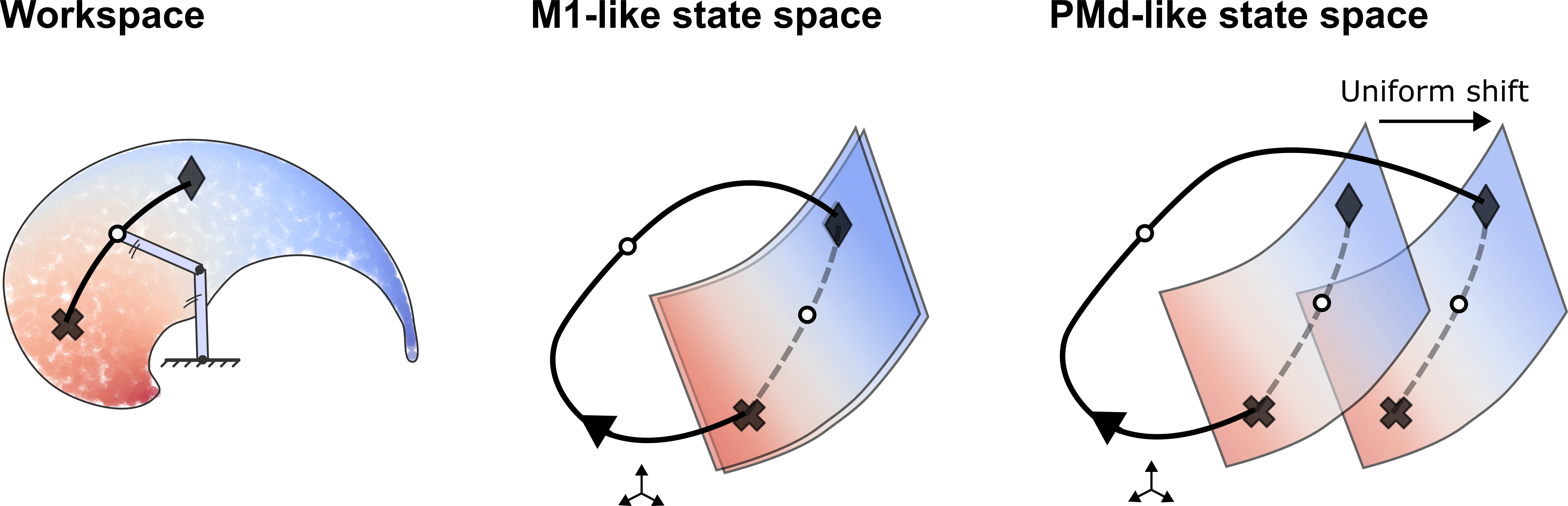This work shows that the motor cortex generates voluntary movement via a three-part compositional neural dynamic: one component tracks arm position, another generates rotational patterns for transitions between positions, and a third tracks overall movement progression.